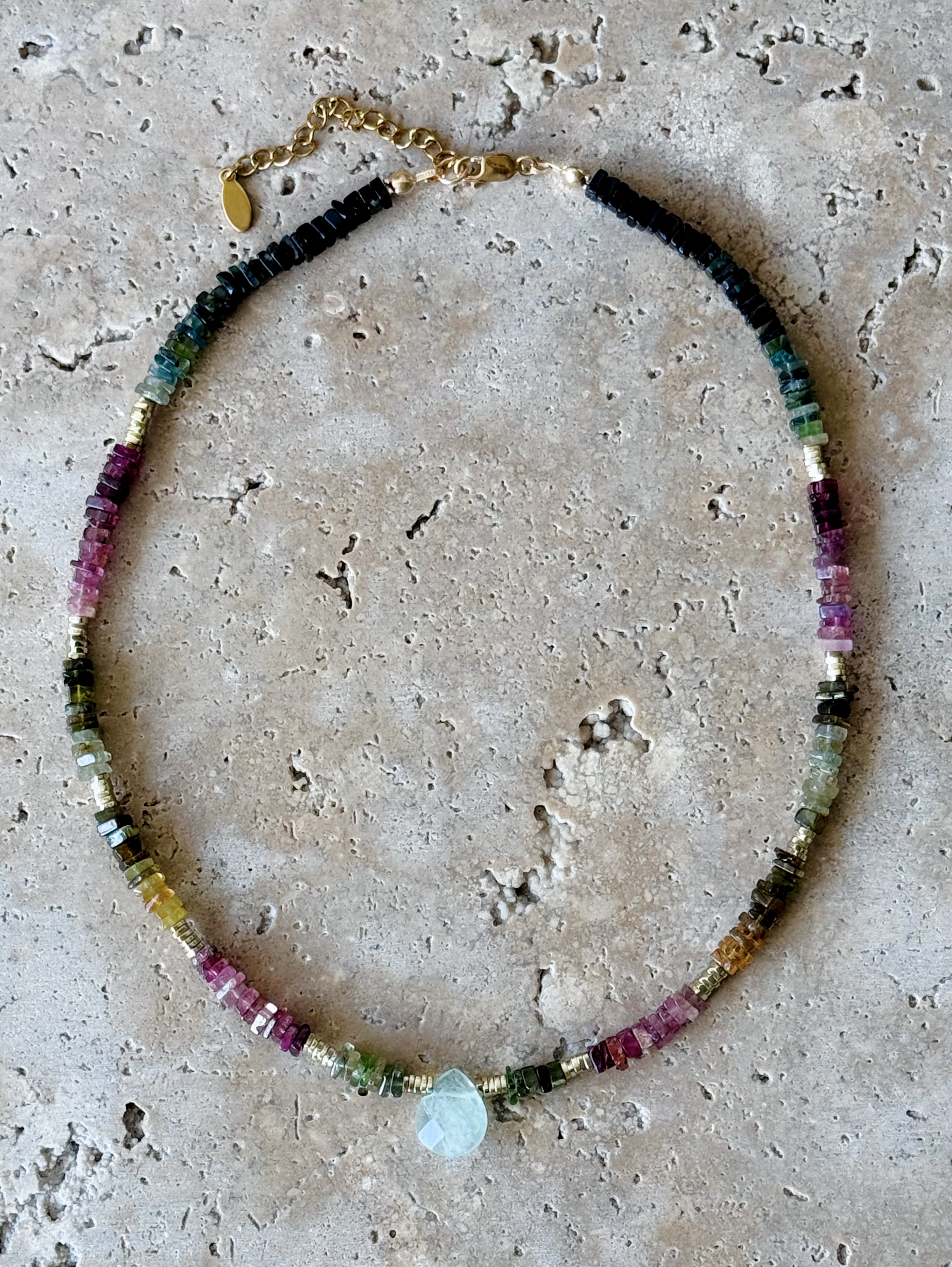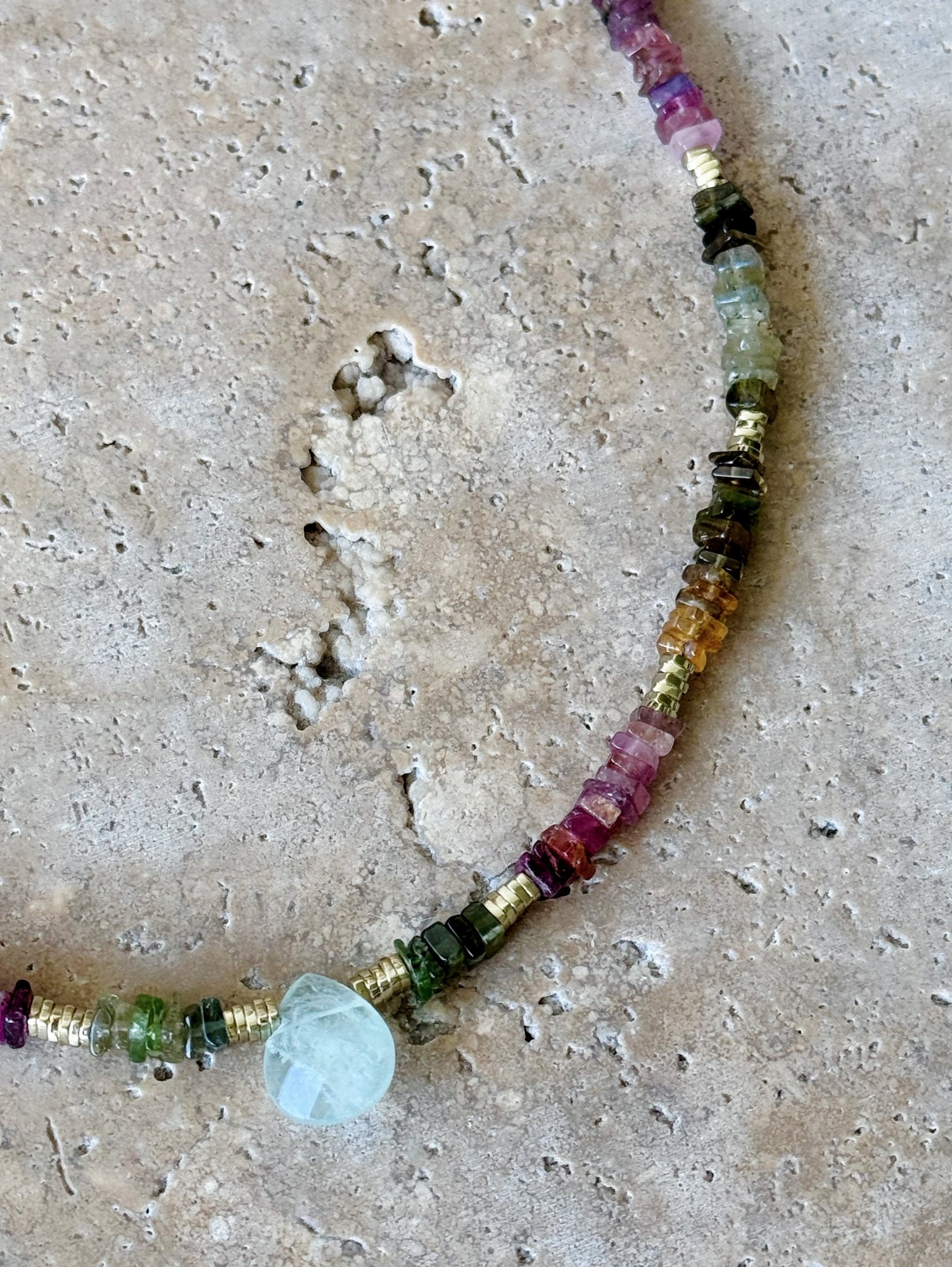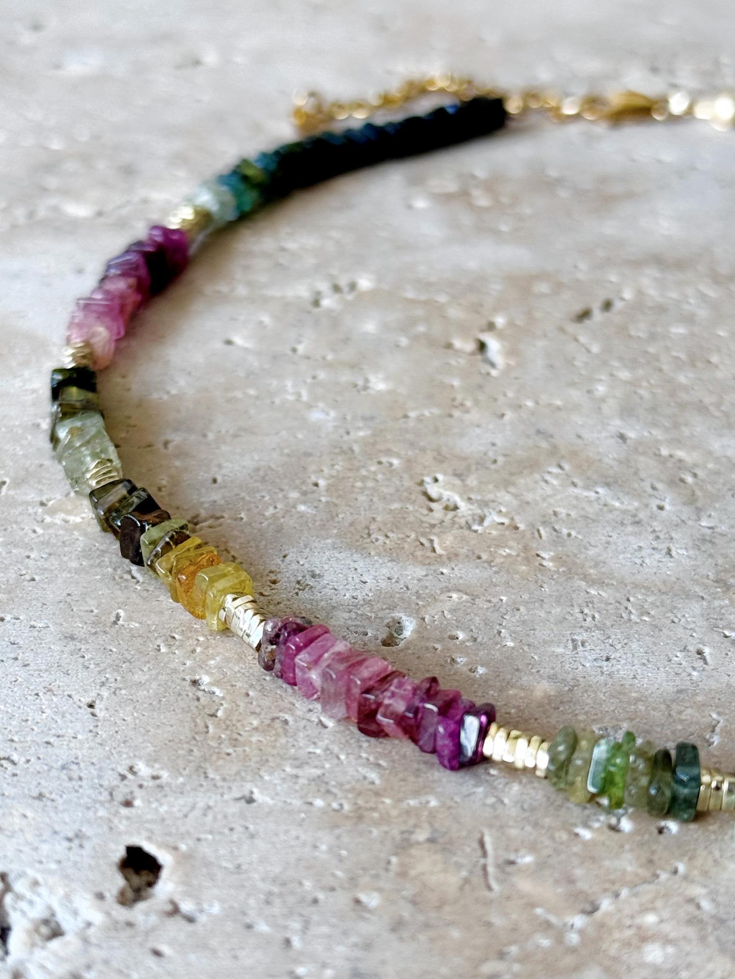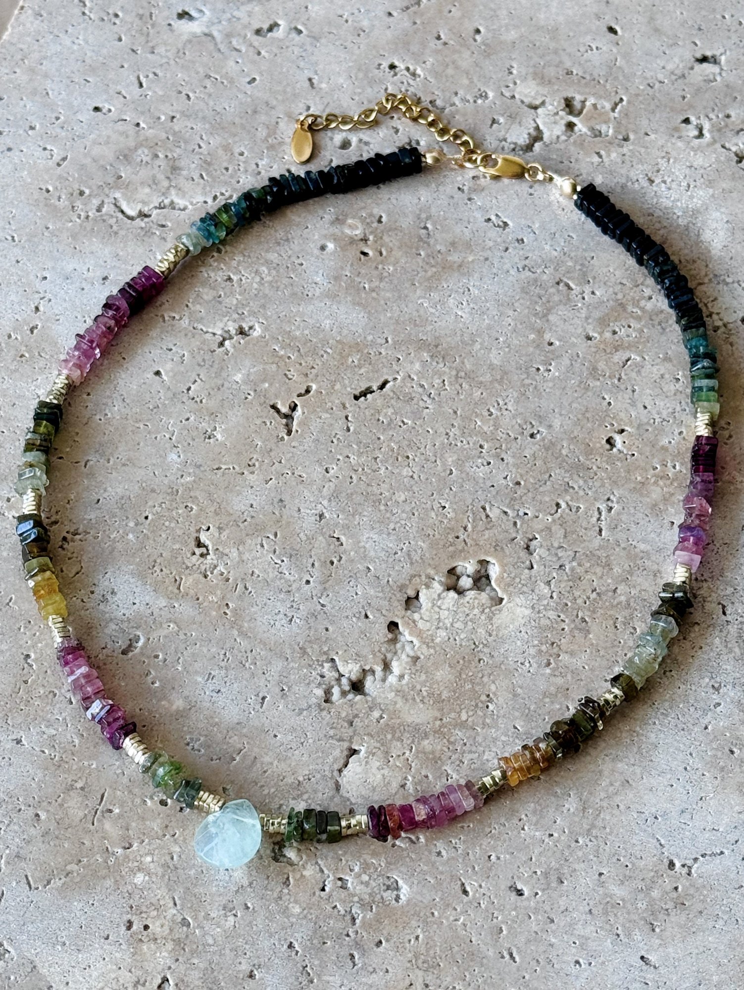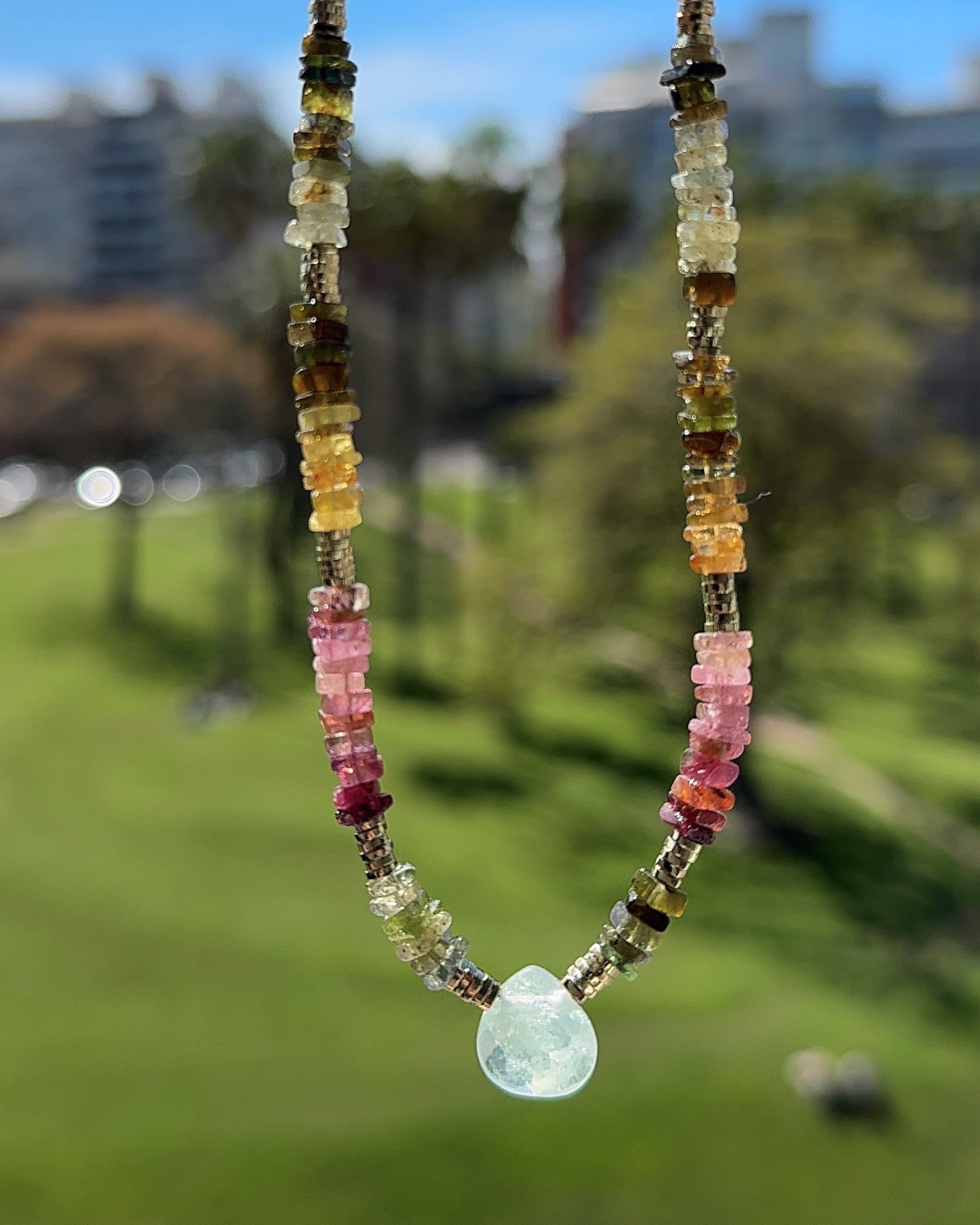 Gargantilla de turmalina con separadores en hematite y gotita de fluorita.