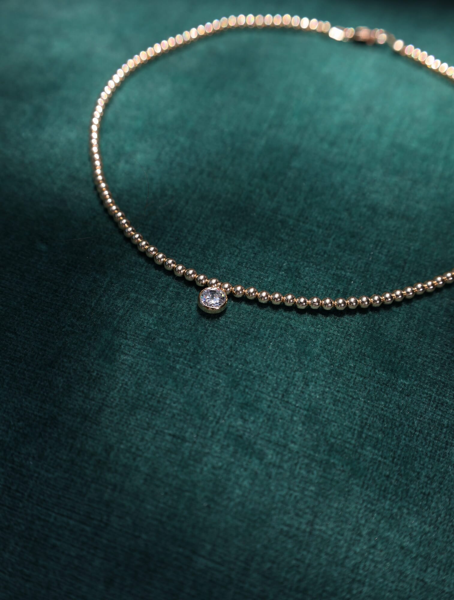 Gargantiilla de cuentas de 3mm en oro laminado 14k (Goldfilled) con punto de luz engarzado en oro laminado. Largo 36 cm + 5 cm de extensor.