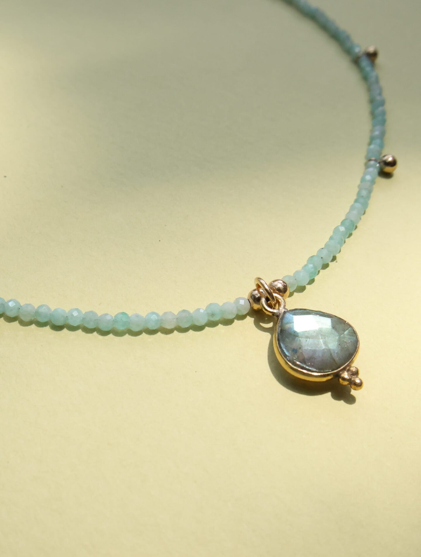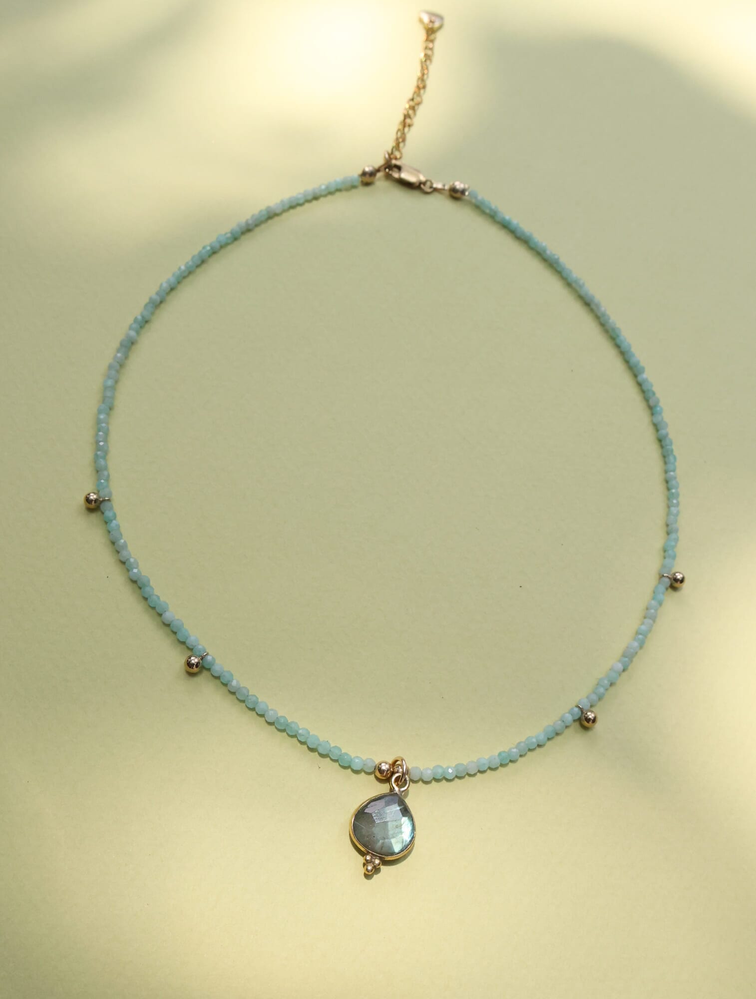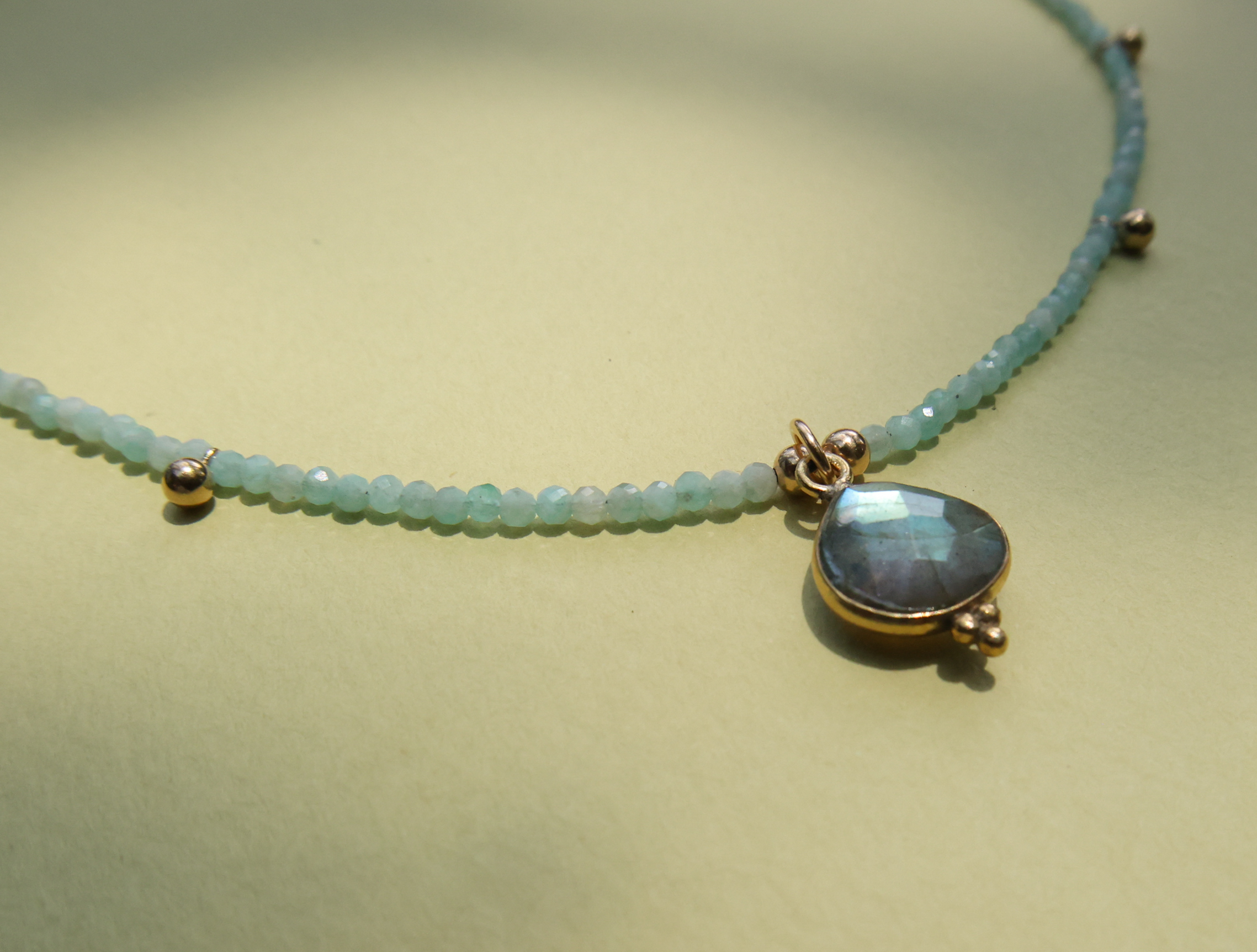 Gargantilla de micro aguamarinas facetadas de 3 mm con separadores y teminaciones en oro laminado. Dije en labradorita. Largo 36 cm + 5 cm de extensor.