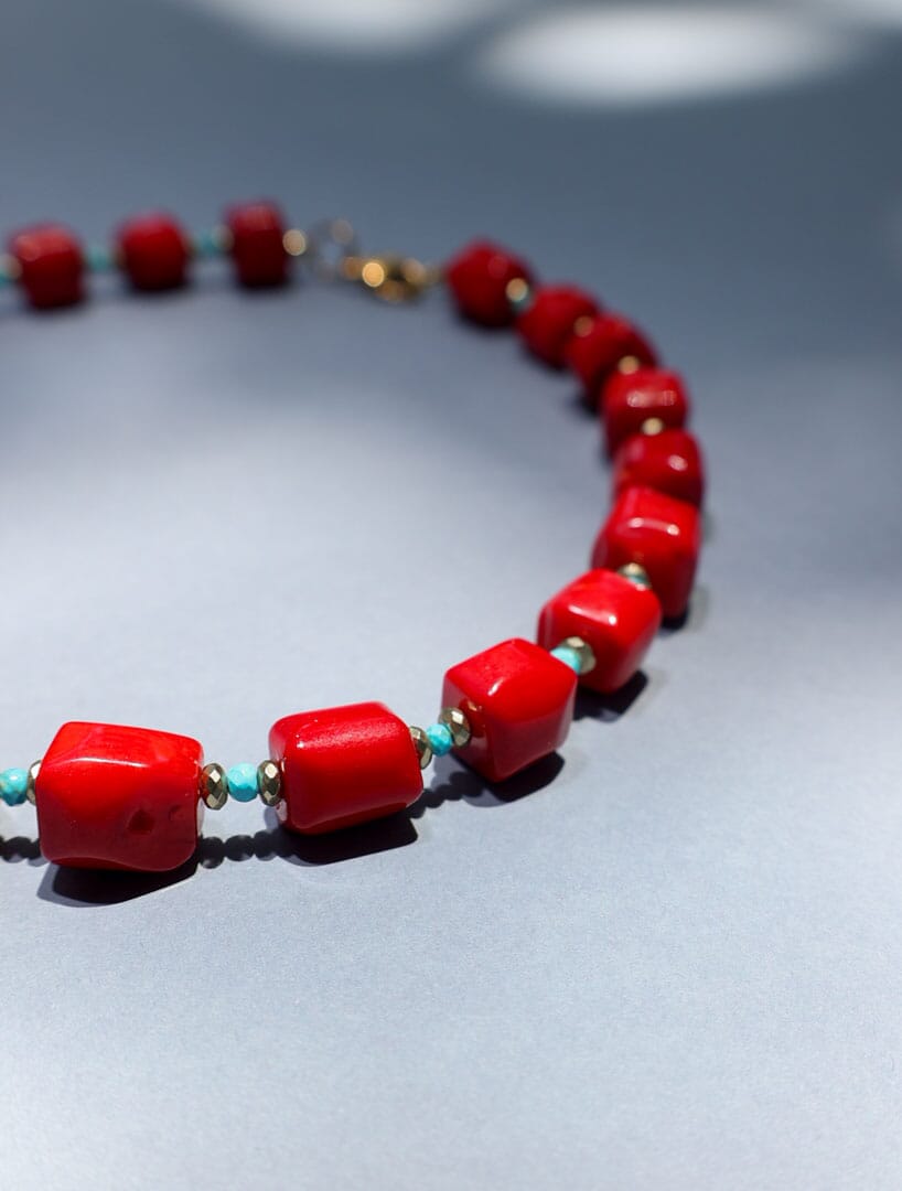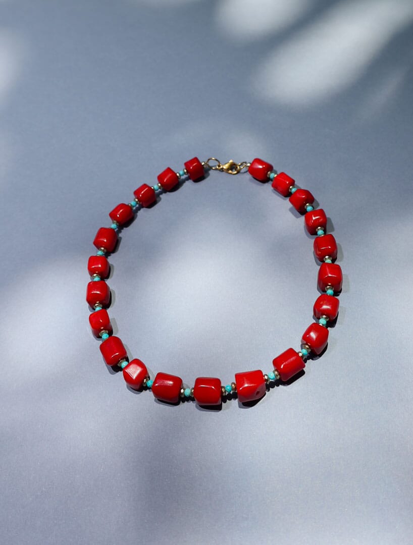 Gargantilla de coral bamboo en forma rectangular de 10 mm con separadores de turquesa. Largo 44 cm + 5 cm de extensor.