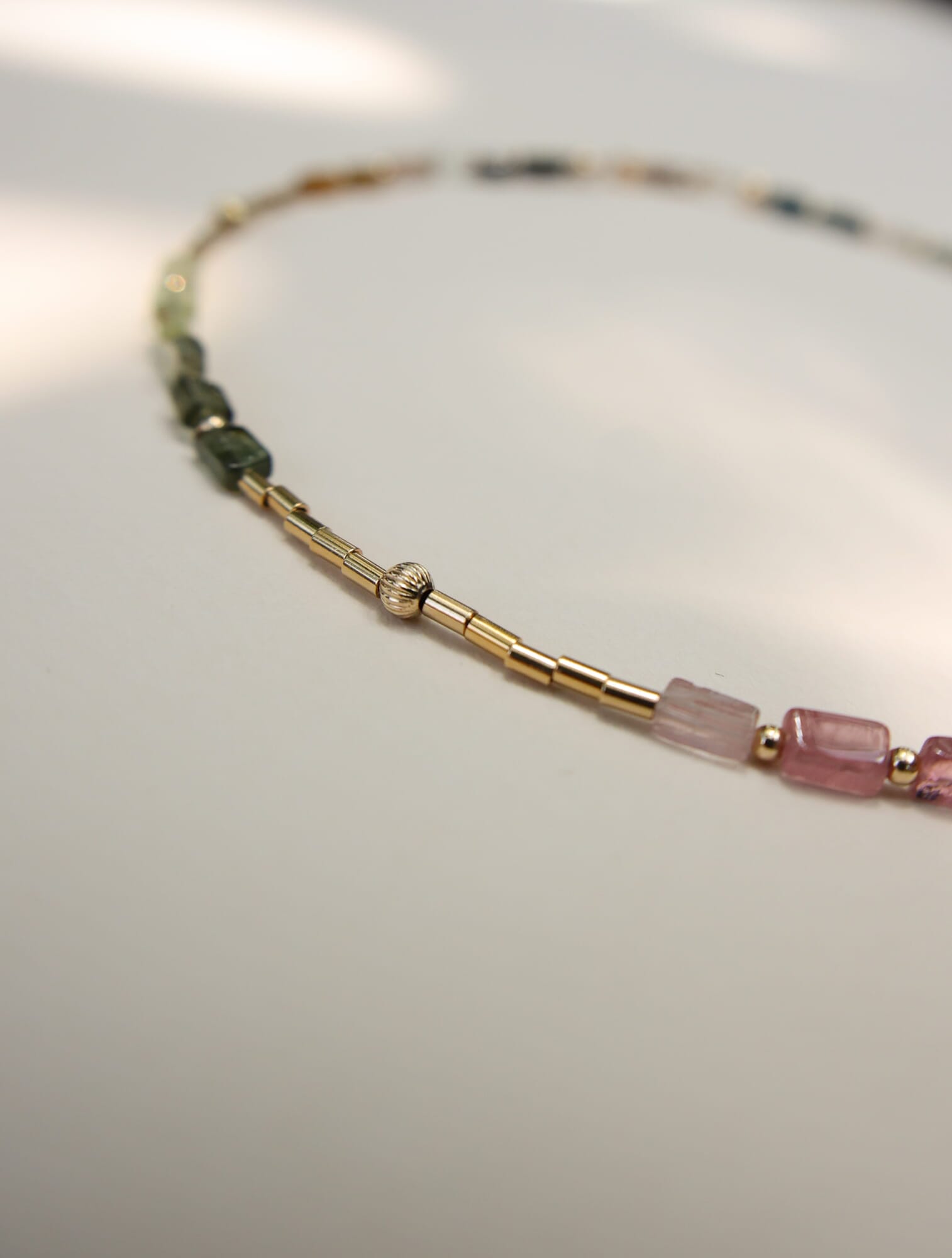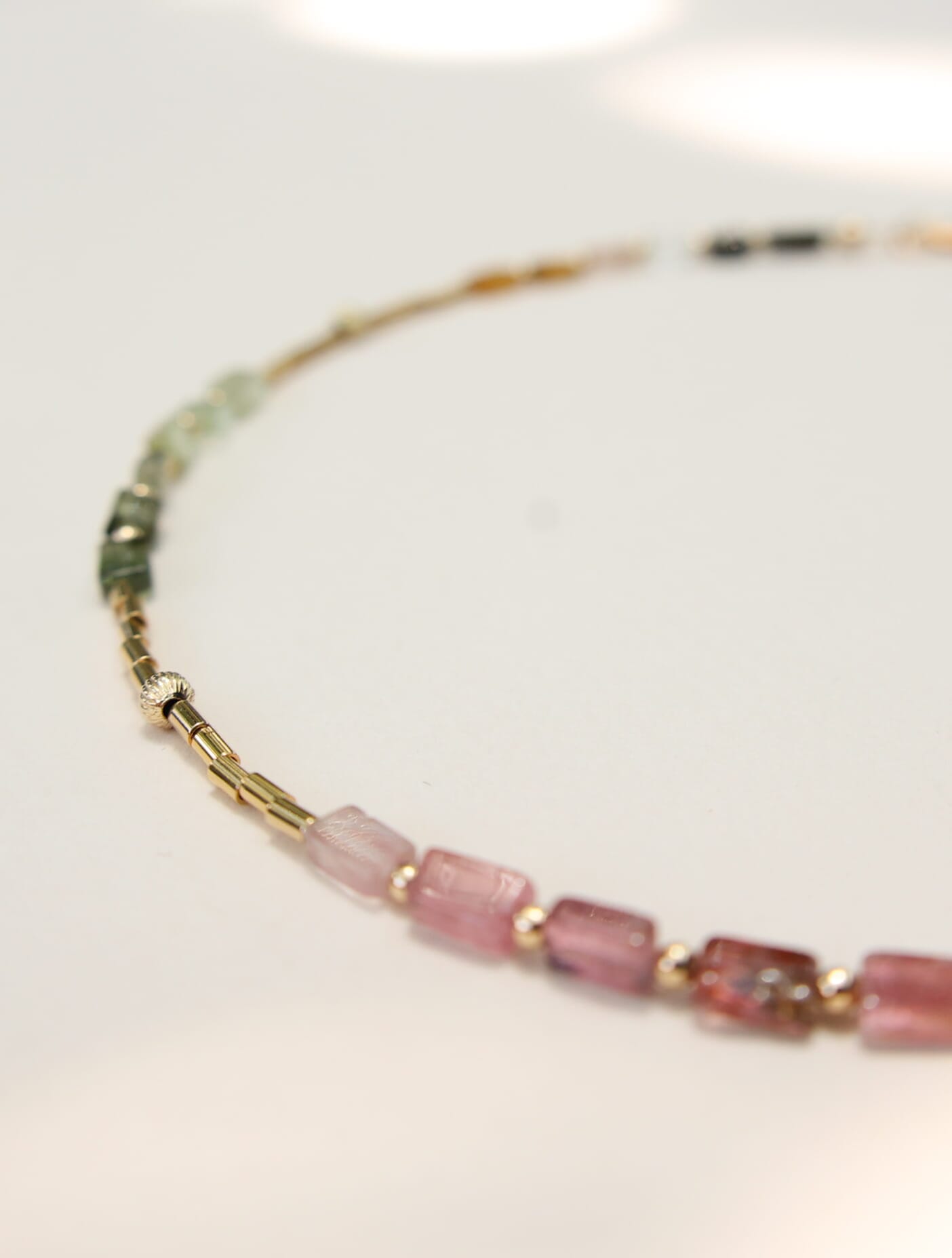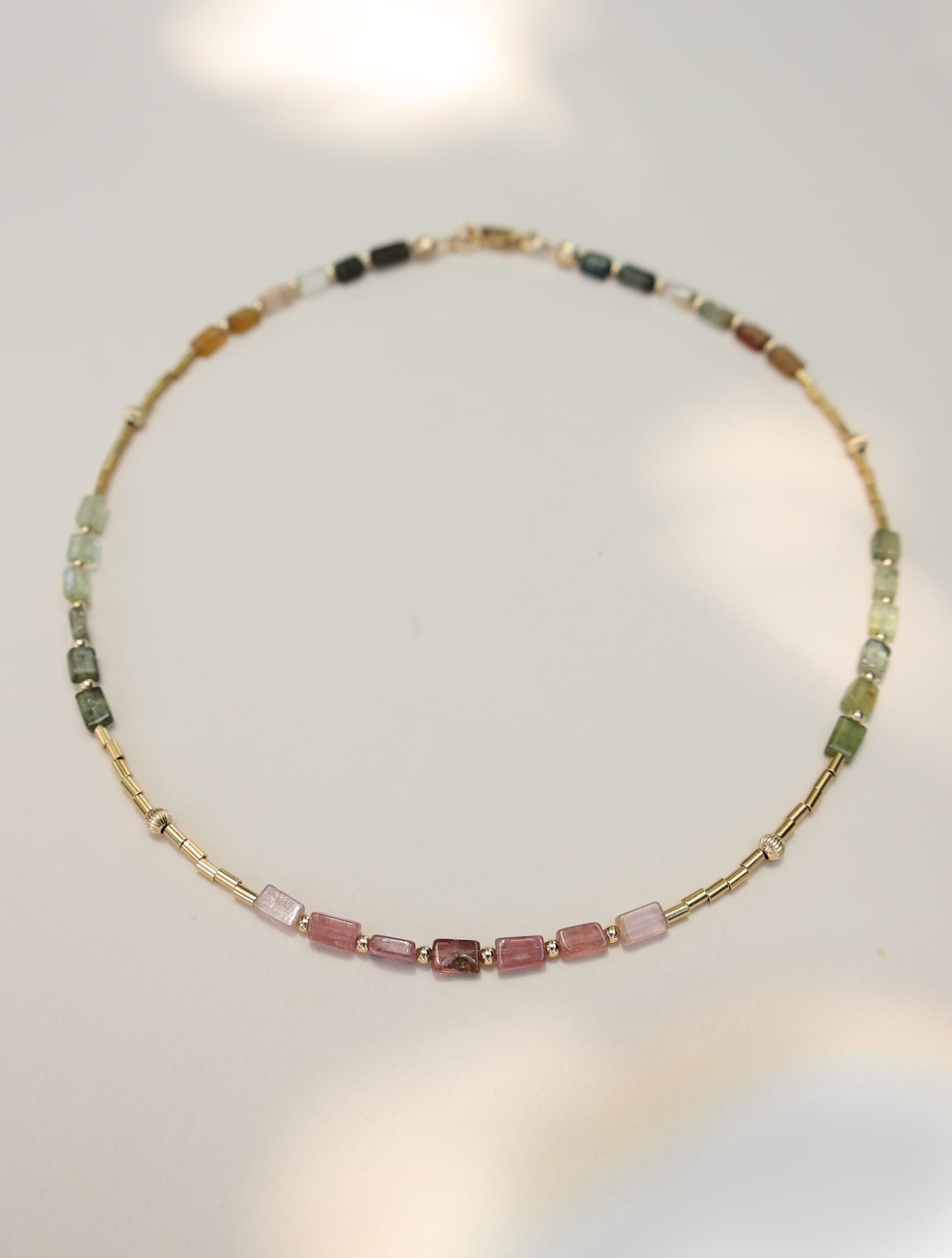 Gargantiilla de tubitos de 3mm en oro laminado 14k (Goldfilled) y turmalinas indias en forma de rectangulo. Largo 36 cm + 5 cm extensor.