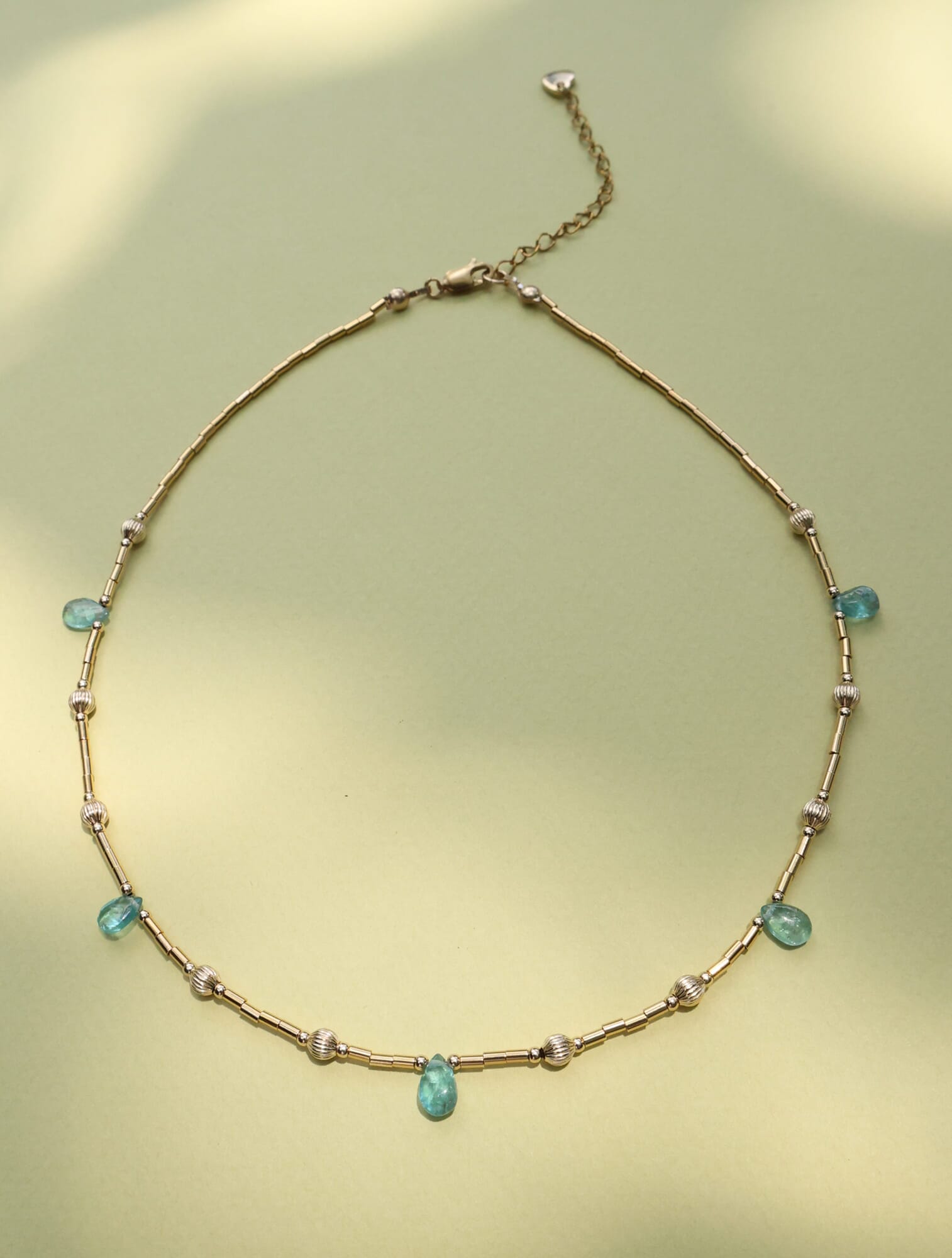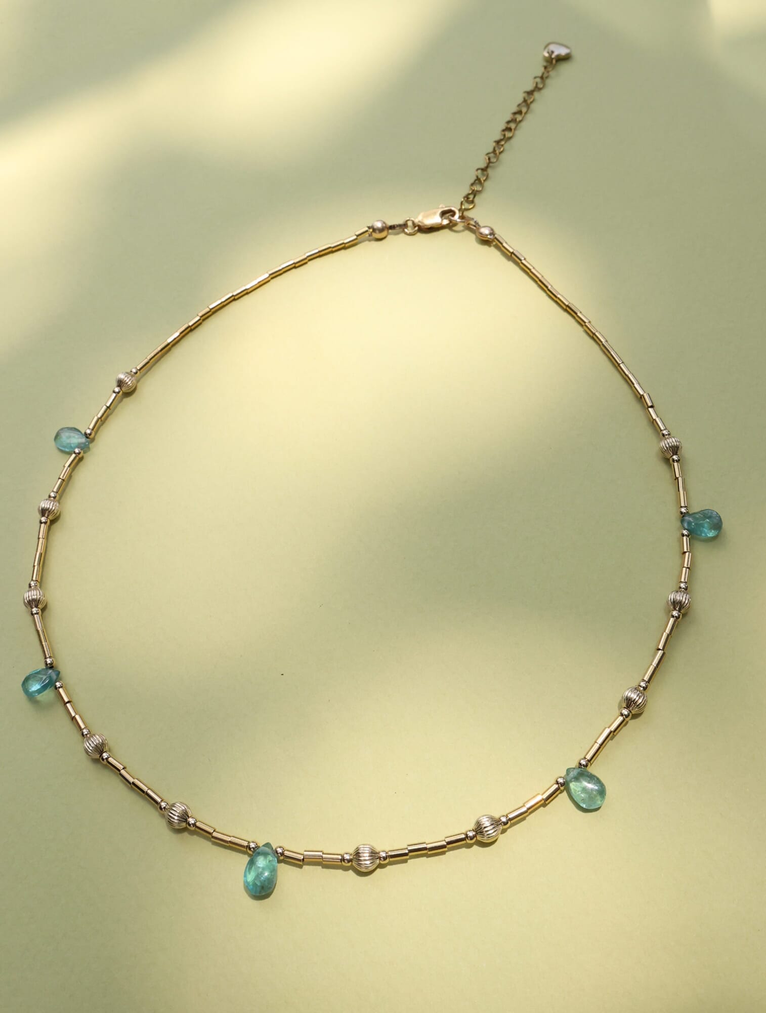 Gargantilla de tubitos de 3mm en oro laminado 14k (Goldfilled) y gotas de aguamarina. Largo 36 cm + 5 cm extensor.