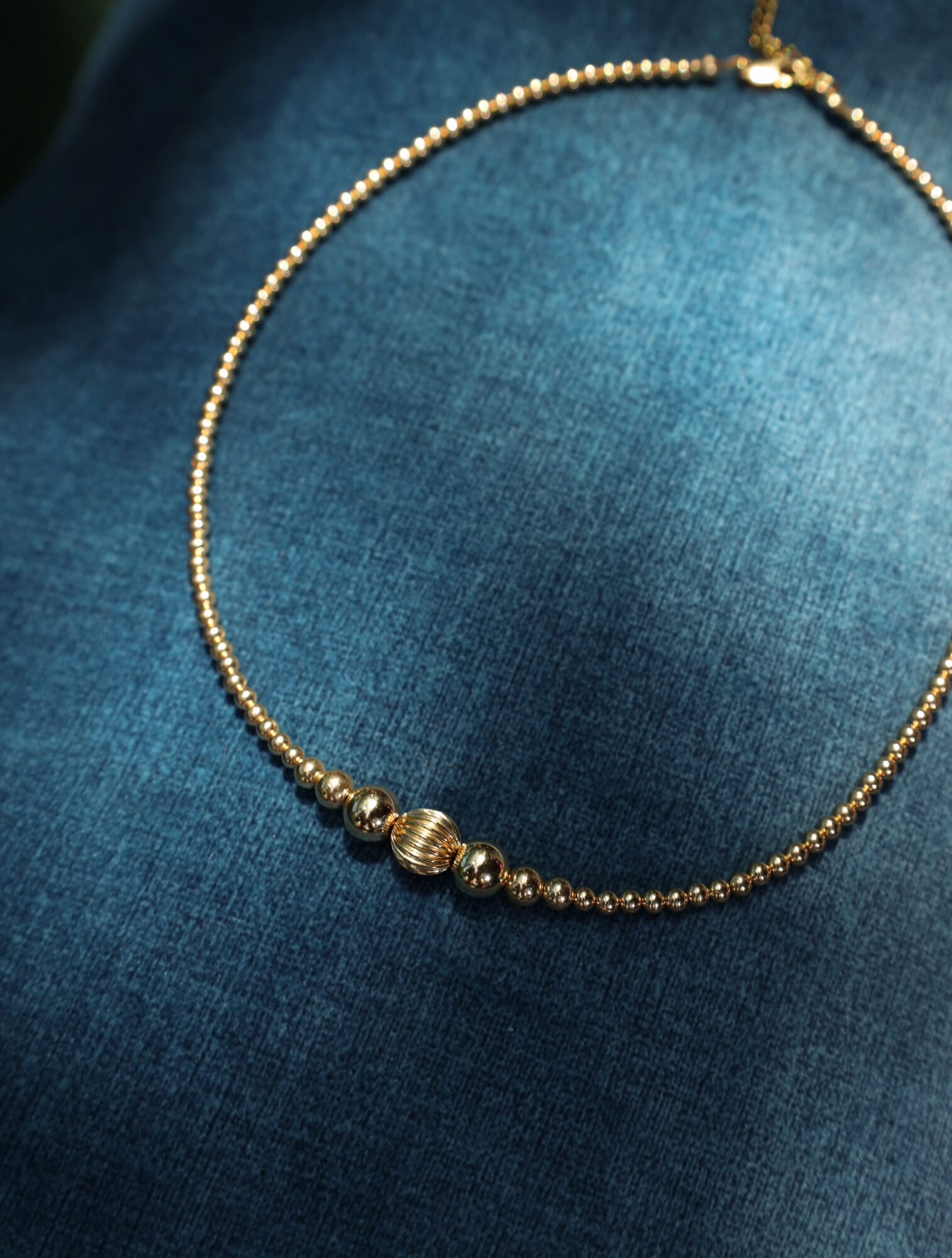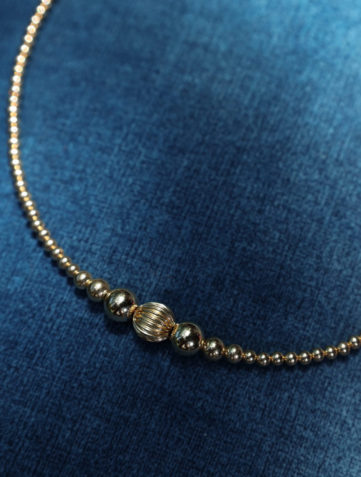 Gargantilla de cuentas de 3mm combinadas con diferentes tamaños, todas en oro laminado 14k (Goldfilled). Largo 39 cm + 5 cm de extensor.