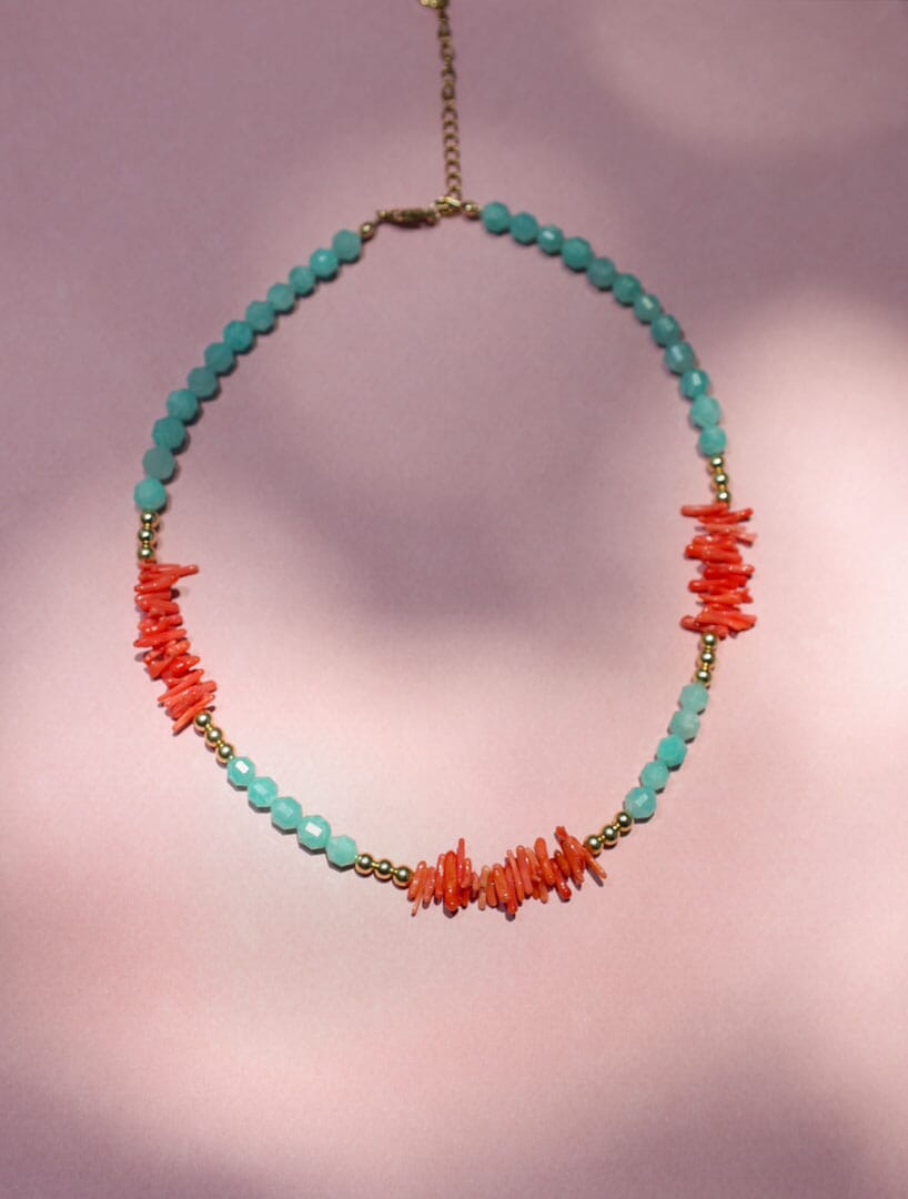 Gargantilla de turquesas con sepadores en oro laminado 14k (Goldfilled) y coral bamboo. Largo 39 cm + 5 cm de extensor.