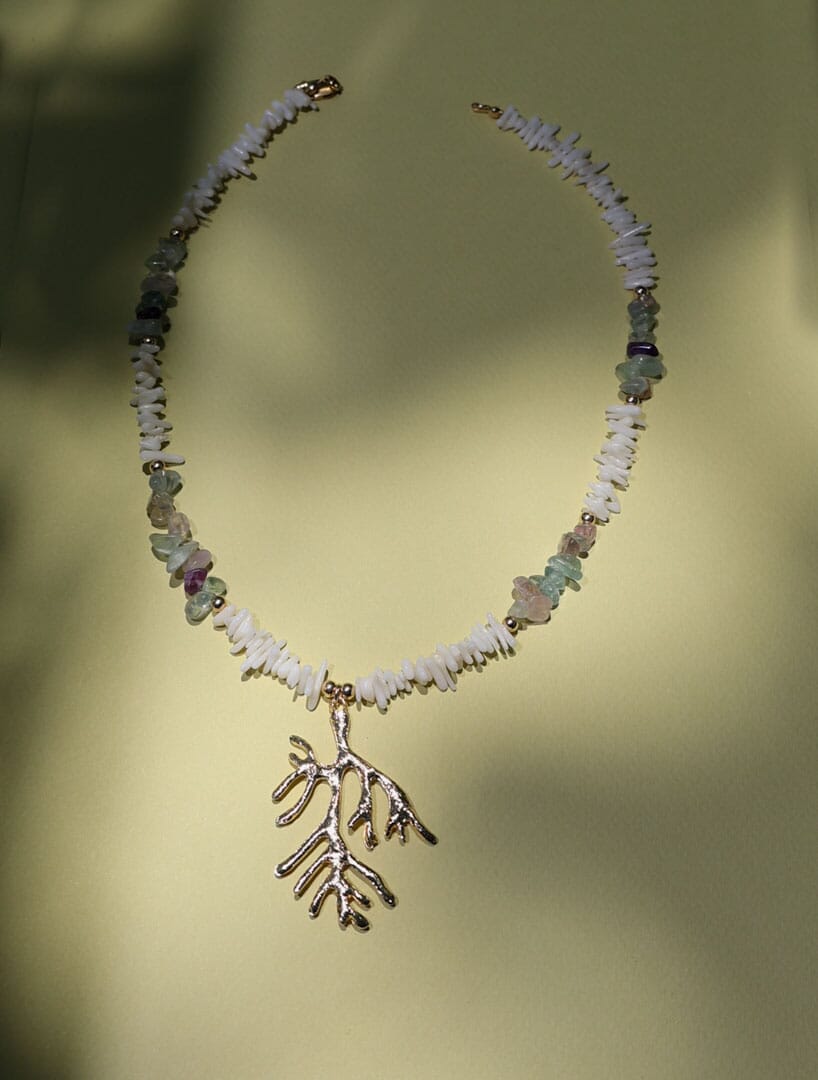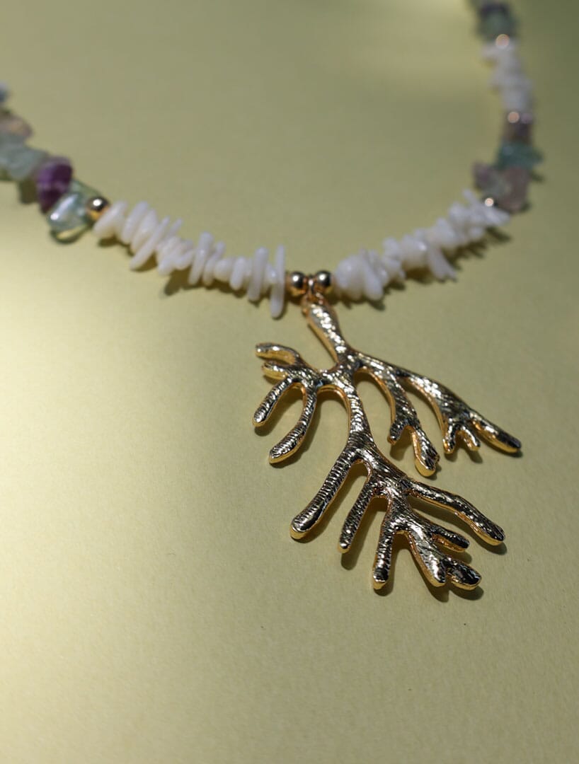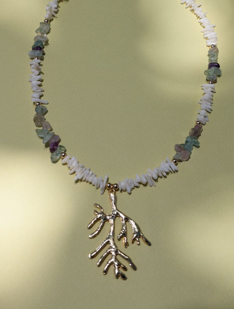 Gargantilla de fluorita en forma de moneda con sepadores en oro laminado 14k (Goldfilled) y dije en forma de coral de bronce bañado en oro 18k. Largo 37 cm + 5 cm de extensor.