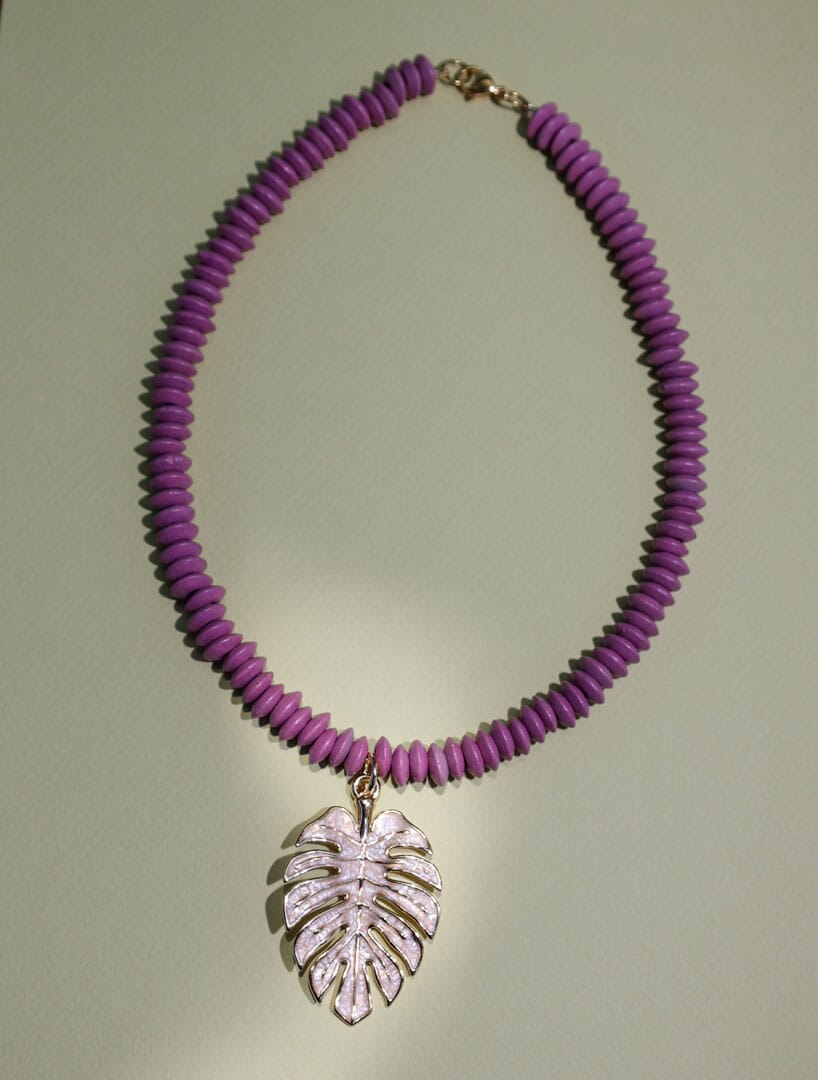 Gargantilla de esferas de madera y dije en forma de hoja en bronce bañado en oro 18K.
