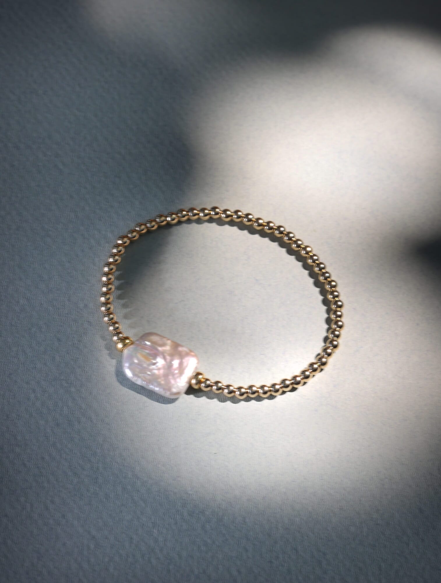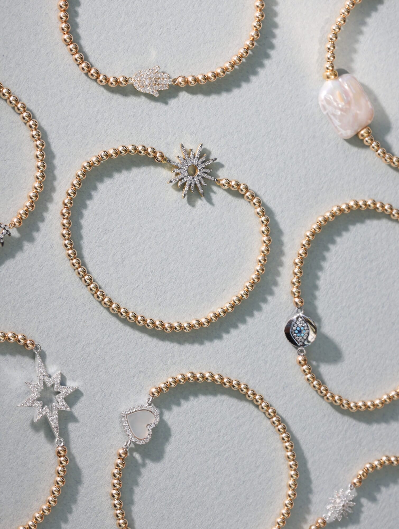 Pulsera elástica de cuentas de 3mm en oro laminado 14 Kilates (Goldfilled) con conector en Plata 925, bañado en oro 18k.