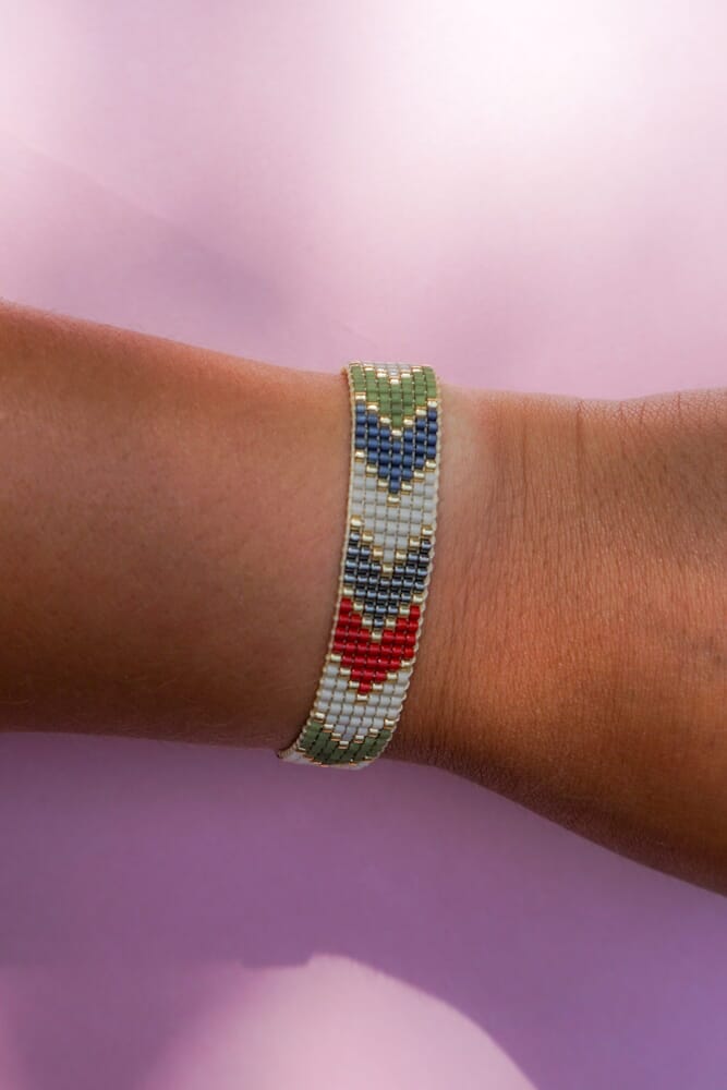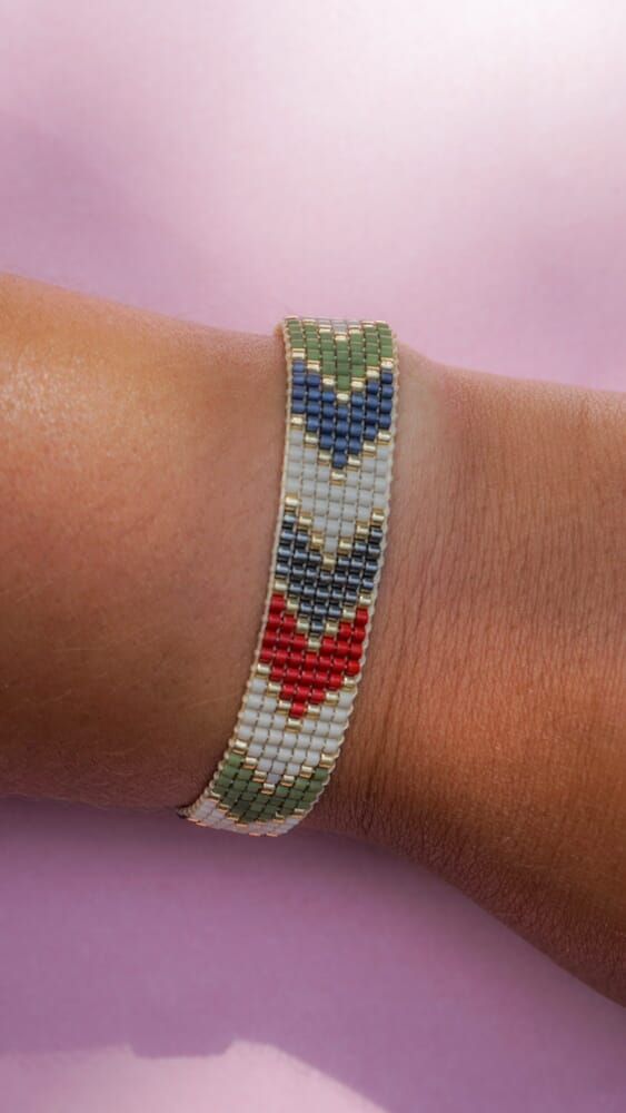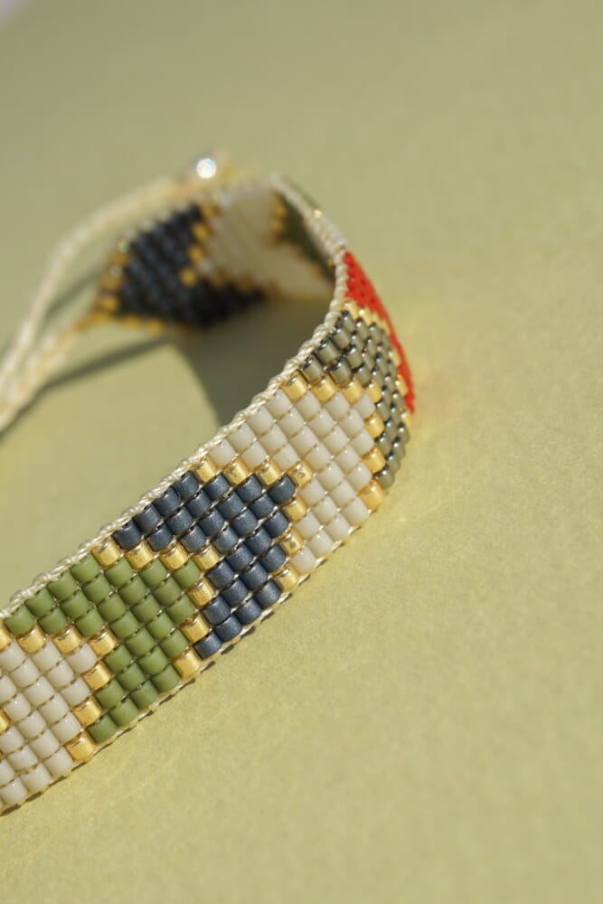 Pulseras tejidas regulables realizadas con canutillos pintados. Ancho: 1cm.